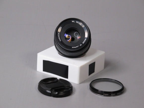 Yashica Lens ML 50mm f2. Includes front/end cap with a Soligor 52 CRS Filter. In perfect condition.